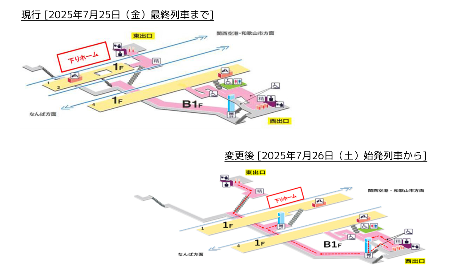南海電気鉄道株式会社(社長:岡嶋 信行)では、堺市事業主体の「南海本線連続立体交差事業」の進捗に伴い、2025年7月26日(土)始発列車から南海本線:諏訪ノ森駅~羽衣駅間において、和歌山市・関西空港方面(以下、「下り」)の線路を仮線に切り替え運行します。これにより、堺・湊・石津川・諏訪ノ森・浜寺公園の5駅において、下り普通列車の一部列車で発着時刻を変更します。また、浜寺公園駅の下りホームを現在の位置から西側に移設することに伴い、西・東改札口から下りホームへの通路の変更や、下り乗車ホームを1・2番のりばから1番のりばのみに変更します。